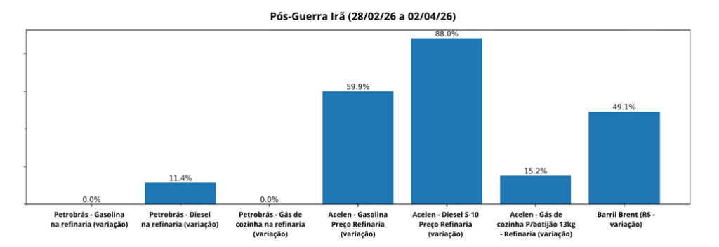 Abaixo, gráfico comparativo dos percentuais de reajustes na gasolina, diesel e gás de cozinha – Petrobrás e Acelen.