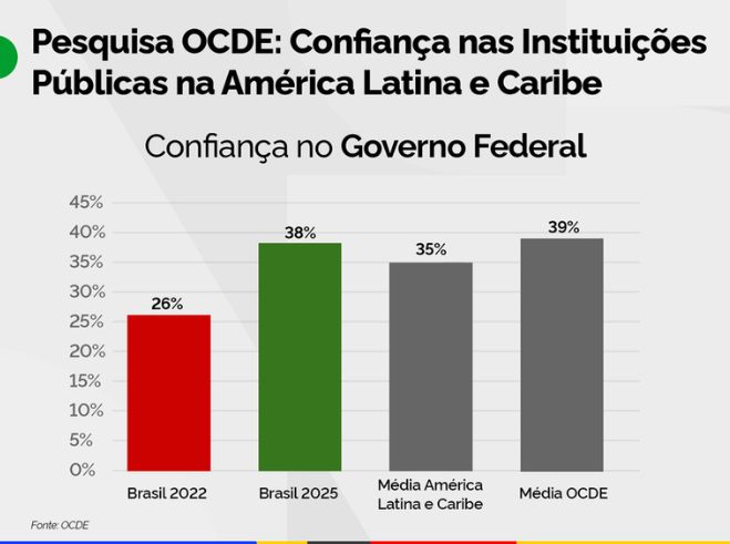 De acordo com a pesquisa, a confiança no Governo Federal subiu de 26% em 2022 para 38% em 2025, superando a média da América Latina e do Caribe (35%). Já a confiança no serviço público aumentou de 24% para 41%, também acima da média regional, de 32%.