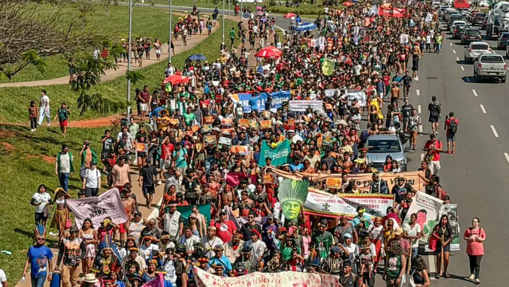 Sob intenso calor, os manifestantes percorreram seis quilômetros até a sede do Legislativo. O Congresso é o foco central das críticas, com o movimento acusando a maioria dos parlamentares de formular e aprovar projetos que ferem direitos constitucionais, ameaçando territórios e modos de vida ancestrais.