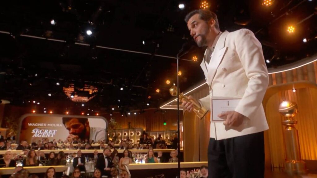 O presidente Luiz Inácio Lula da Silva telefonou nesta quarta-feira (14) para o ator Wagner Moura e o diretor de cinema Kléber Mendonça Filho, vencedores do Globo de Ouro pelo filme Agente Secreto. Na chamada, acompanhado da primeira-dama Janja da Silva, o presidente disse que fazia um gesto de reconhecimento pela grandeza do cinema brasileiro e classificou a premiação como “um espetáculo extraordinário“. Um vídeo da ligação foi postado nas redes sociais de Lula.
