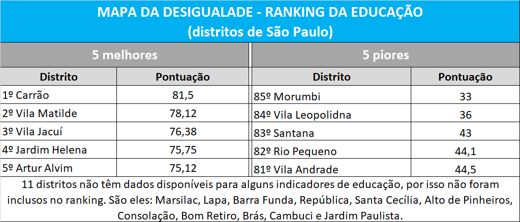 Dessa forma, o ranking da educação reflete o desempenho de cada distrito no conjunto dos indicadores temáticos que compõem o Mapa da Desigualdade. A tabela abaixo mostra os cinco distritos que obtiveram a melhor e a pior classificação: